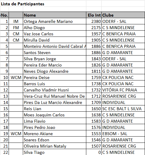 Estes 22 inscritos representarão 9 clubes nacionais (ODERF e EBSOM do Sal, Amarante e Mindelense de S. Vicente, Casa do Benfica, Vitória FC e CX Policia Nacional da Praia, Rosariense CRG de St. Antão e ESBLS de S. Nicolau), sendo que 2 desses clubes são clubes escolares (ESB Olavo Moniz do Sal e ES Baltazar Lopes da Silva de S. Nicolau).